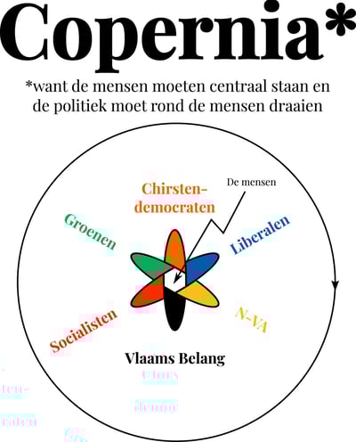 Waarom kiest Copernia ervoor om altijd de consensus te volgen? Aan de ene kant is het onze ambitie om het politieke proces te deblokkeren. Door met ons een coalitie te vormen kunnen de traditionele partijen met minder partijen aan 51% van de zetels raken. Aan de andere kant streven we ernaar om systeemfouten aan te pakken met concrete bugfixes. Copernia richt zich 100% op enkele essentiële kwesties die een aanzienlijk verschil kunnen maken in het leven van mensen. Er blijft dus 0% over om standpunten te vormen over de andere onderwerpen. Voor die dossiers mogen de andere coalitiepartners tot een akkoord komen.